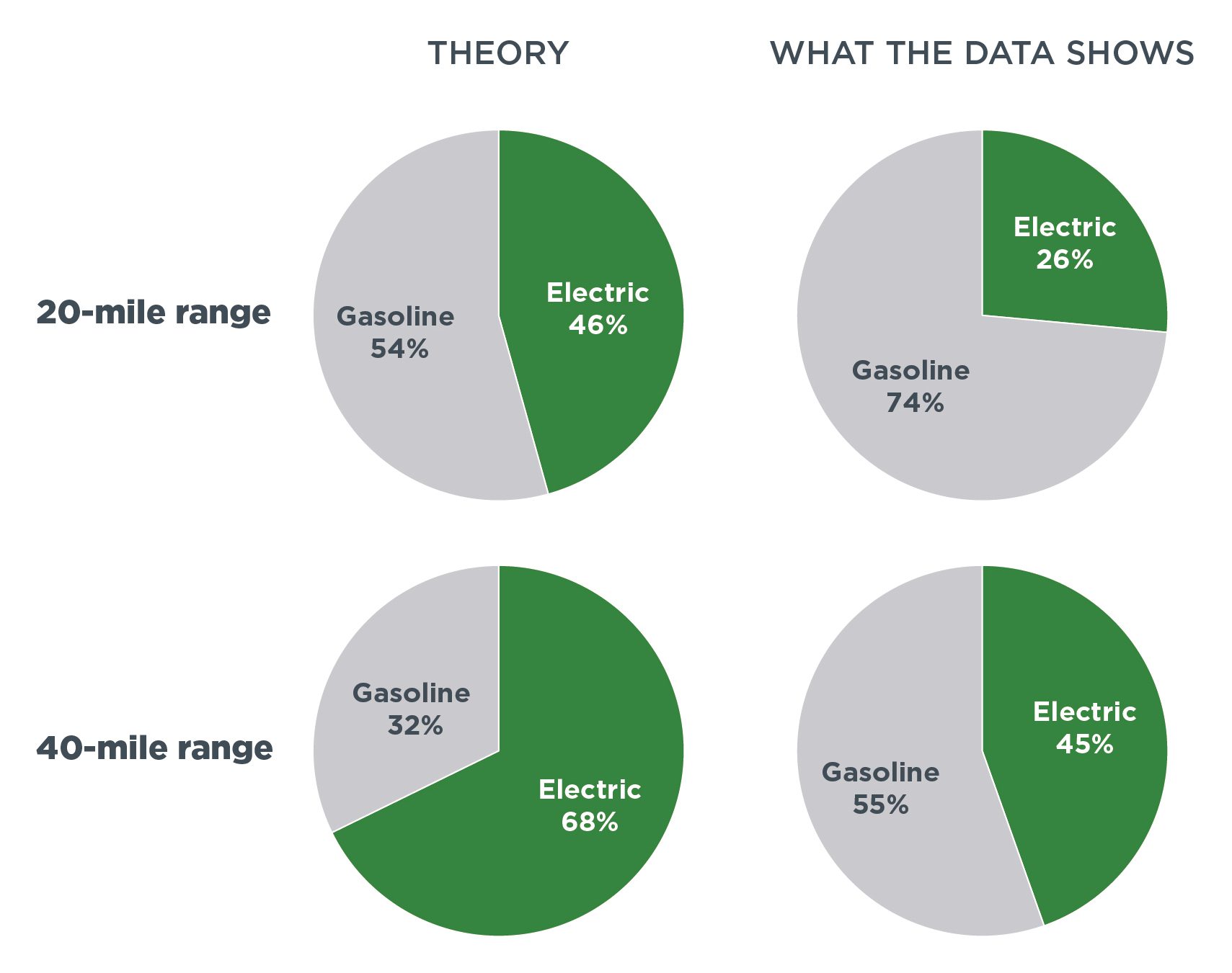 Based on this methodology, a PHEV with a 40-mile electric range could cover about 70% of its miles with electricity. But there’s a problem—we know it rarely plays out this way.